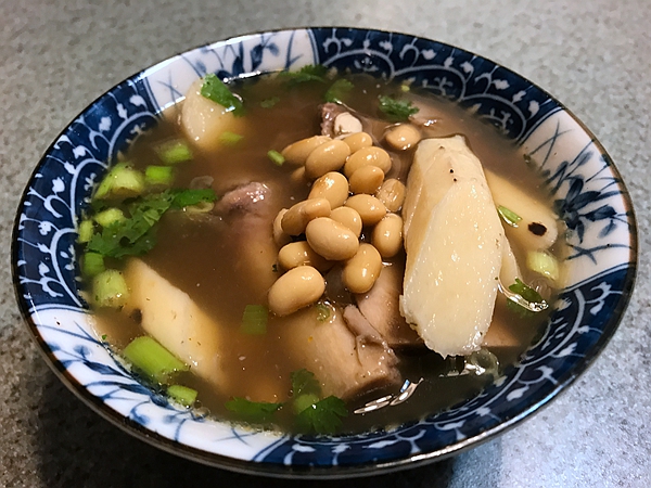加了点铁棍山药继续炖,洗漱完毕,往碗里磨点胡椒粉,撒点海盐和葱花,热汤冲进去~~~好香:)