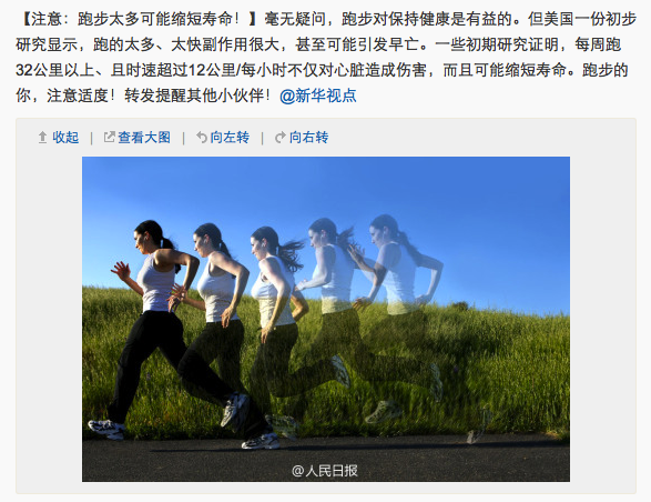 最初引起我注意的是@人民日报 微博上的消息。发布几个小时后转发过万,评论数千。这和那些瞬间转发几十万的那些娱乐圈的破事儿根本不能比,但是爱跑步的我不能不关心。我一向认为跑步可 以使人更健康,经过两年多的持续锻炼,我体检的各项指标都正常了。我还经常给身边的朋友讲一个笑话:“专家说,爱跑步的人会更健康长寿,通常比不跑步的人 可以多活个三五年,不过这三五年时间都用来跑步了。”