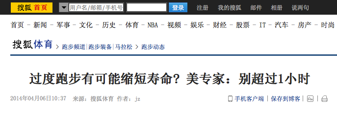 走中庸之道是相对安全的,因此“过犹不及”的言论一向深得人心,这篇微博的标题就是如此。跑步太多?怎么样算多呢?缩短寿命?有什么根据?于是我通过搜索引擎查找相关报导。在百度中搜索“跑步太多可能缩短寿命”