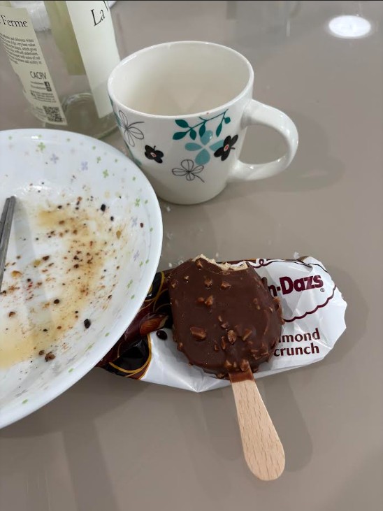 空盘子还没过瘾,再来根雪糕当饭后甜点。吃完这最后一口,怀着负罪的心,又要过好长一段时间的清苦日子了。