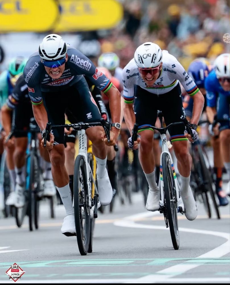 最后一公里,他开始发射,波加查和卖鱼哥紧跟其后,当然身材相对瘦小的他们,怎么搞得过荷兰炮神MVDP,最后MVDP毫无悬念获得赛段冠军。