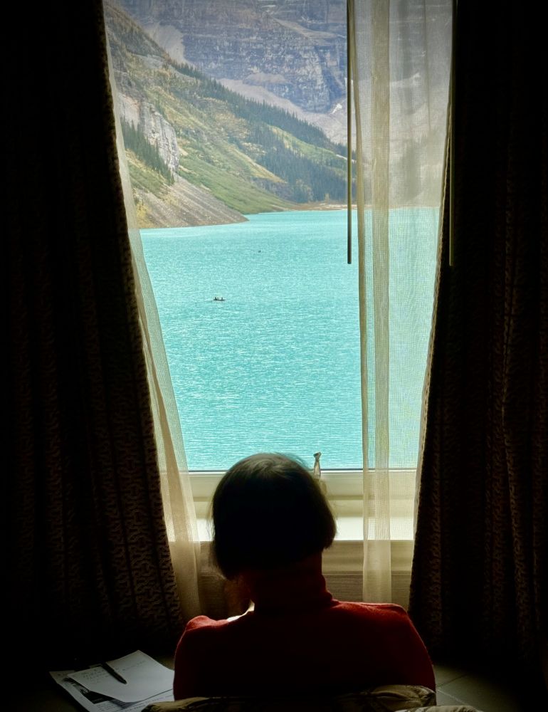 明天要从这个美丽的旅馆check out,去jasper。妈妈坐在窗前享受每一时刻。在这里的四天,真的是旅馆风景的天花板了。