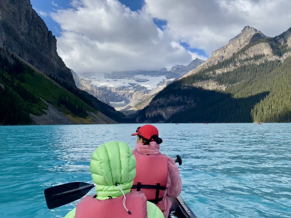 在路易湖划船,看着碧蓝的水在身边荡漾,远处的雪山熠熠生辉,山崖上的金松开始变色,真的是美得让人失语。