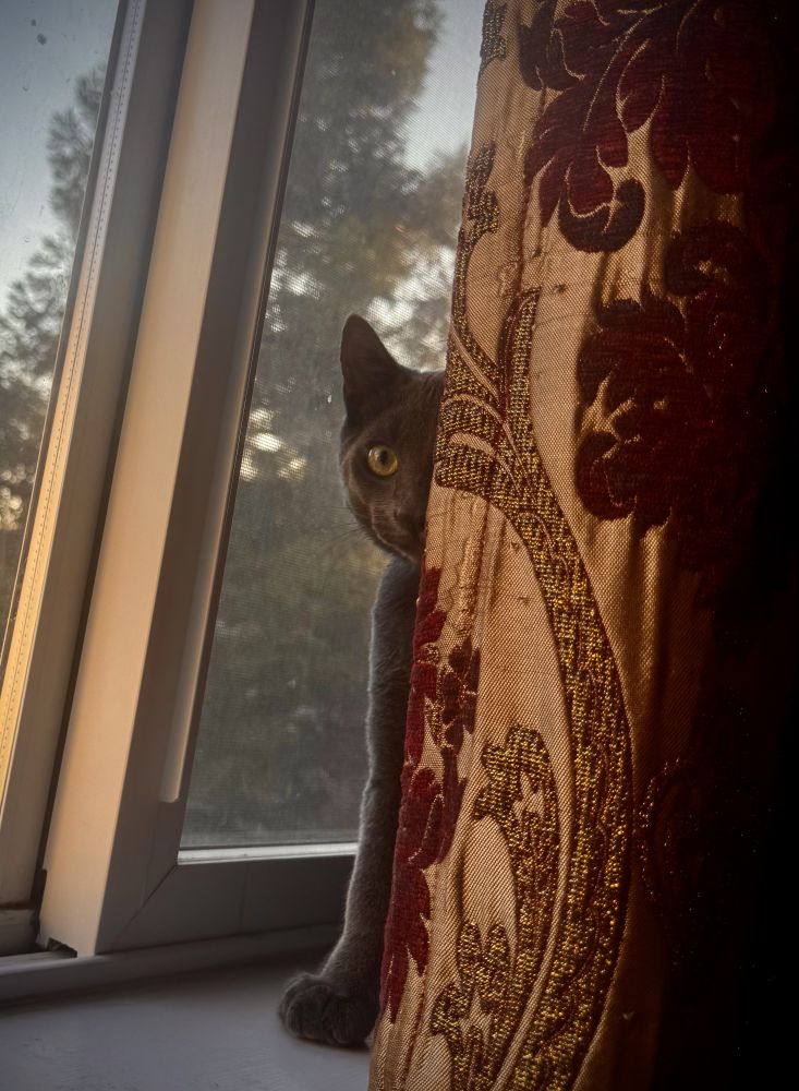 跑步回来,猫猫在窗帘后面,跟我眉来眼去捉迷藏