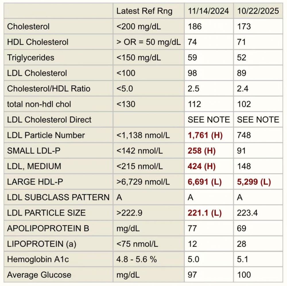我的LDL总数虽然还行,但是这几年也慢慢往上走,我妈妈不到100斤,LDL都很高。所以我还是挺注意的。但是也架不住年龄往上走。去年年底第一次做了cardiac lipid panel,把我吓一跳。我的小颗粒LDL很高,所以心血管风险也相对高。虽然饮食也已经比较注意了。