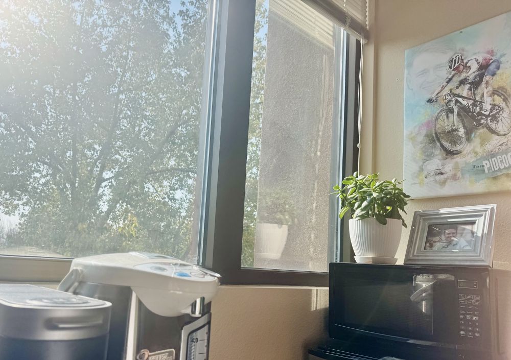 我的办公室阳光明媚,窗外温暖如春。Tom Pidcock在阳光下显得格外俏皮。