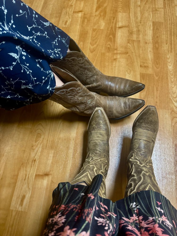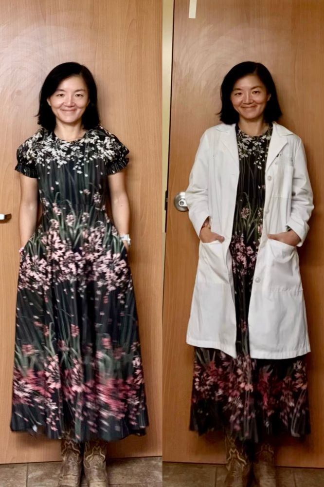 我这个病人看了好多年了,从她是个很年轻的女生就开始看,现在已经有两个孩子了。长得非常漂亮,性格也很好。每次看到她都很愉悦,呵呵。 今天她穿了牛仔靴,配上长裙,特别漂亮,正好我也穿了长裙靴子,赶紧合影一张。呵呵。得到她批准,可以贴,哈哈