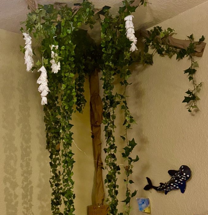 要说稀奇古怪,爱美丽肯定是第一名。她最近把自己的房间装饰得跟热带雨林一样,拿纸板做了树干,白纸做了树上的花,然后又做了了一条鲨鱼贴在墙上,所以我也搞不懂了。