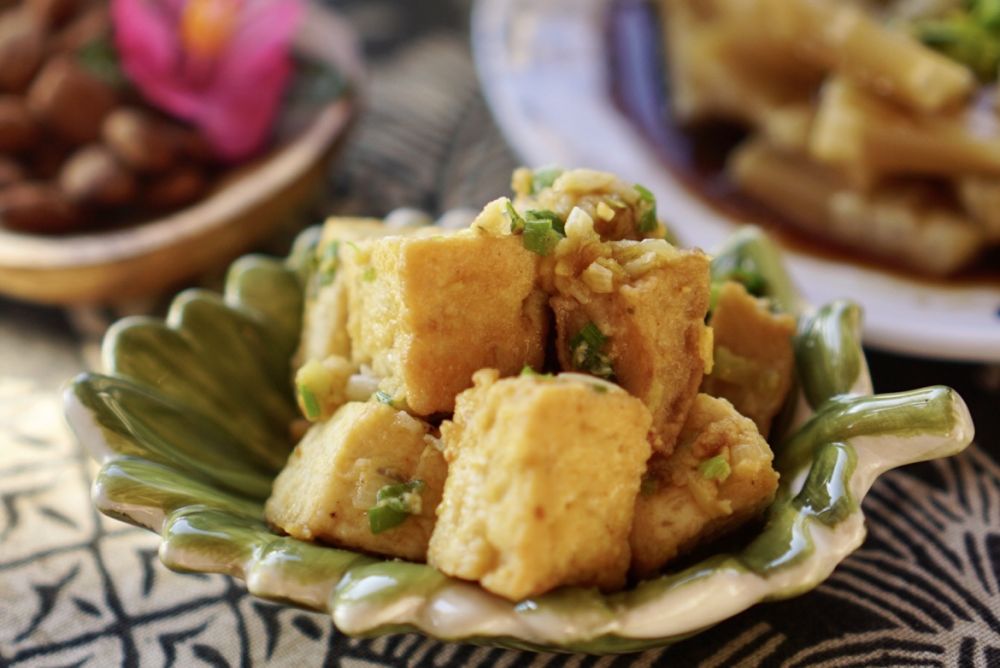 还做了金沙豆腐,炸过的豆腐跟杏鲍菇,口感配合彼此,裹上煸炒过的咸蛋黄跟青葱碎. 都是好配啤酒的小食,