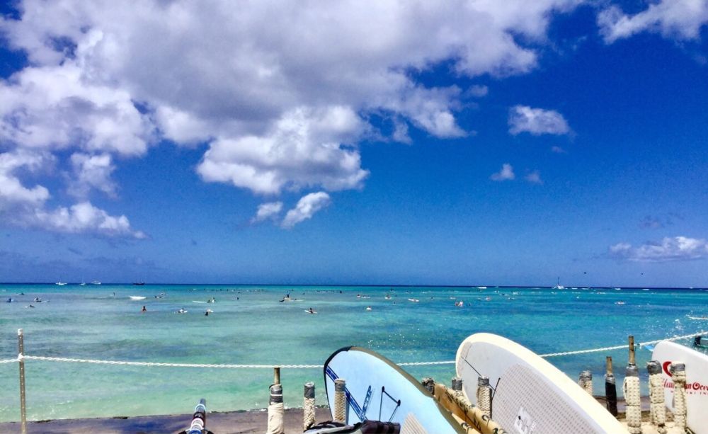 继续前行,在以冲浪著名的威基基海滩让二个孩子上了一堂冲浪课。。