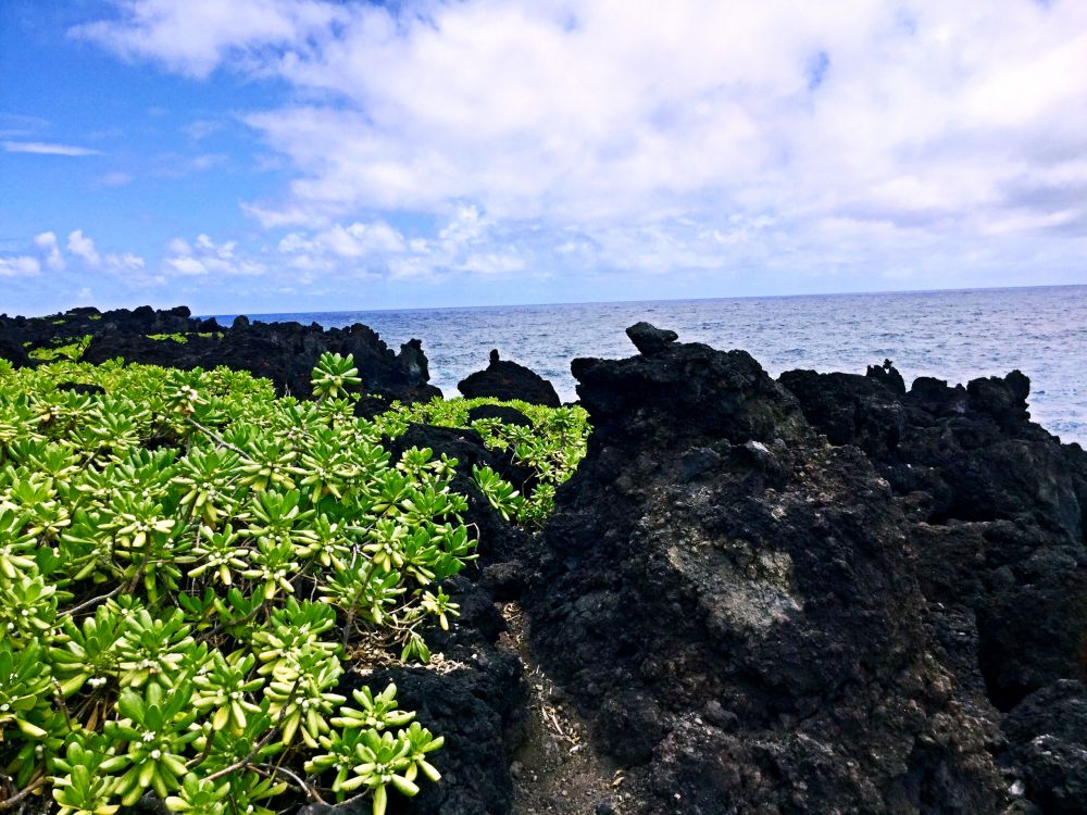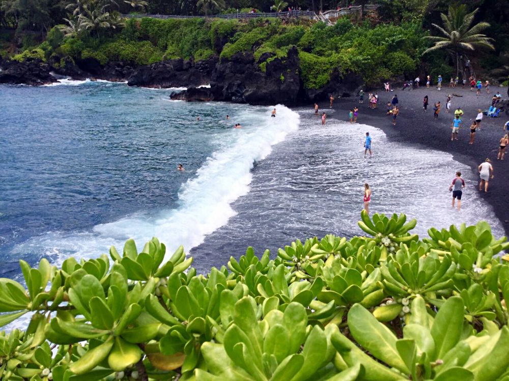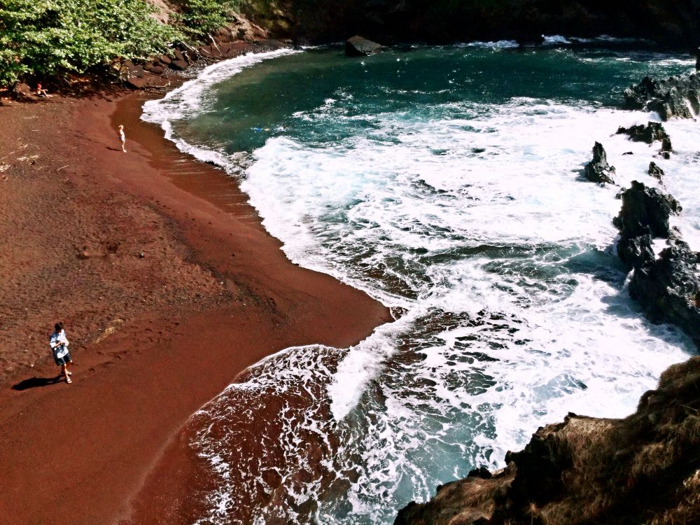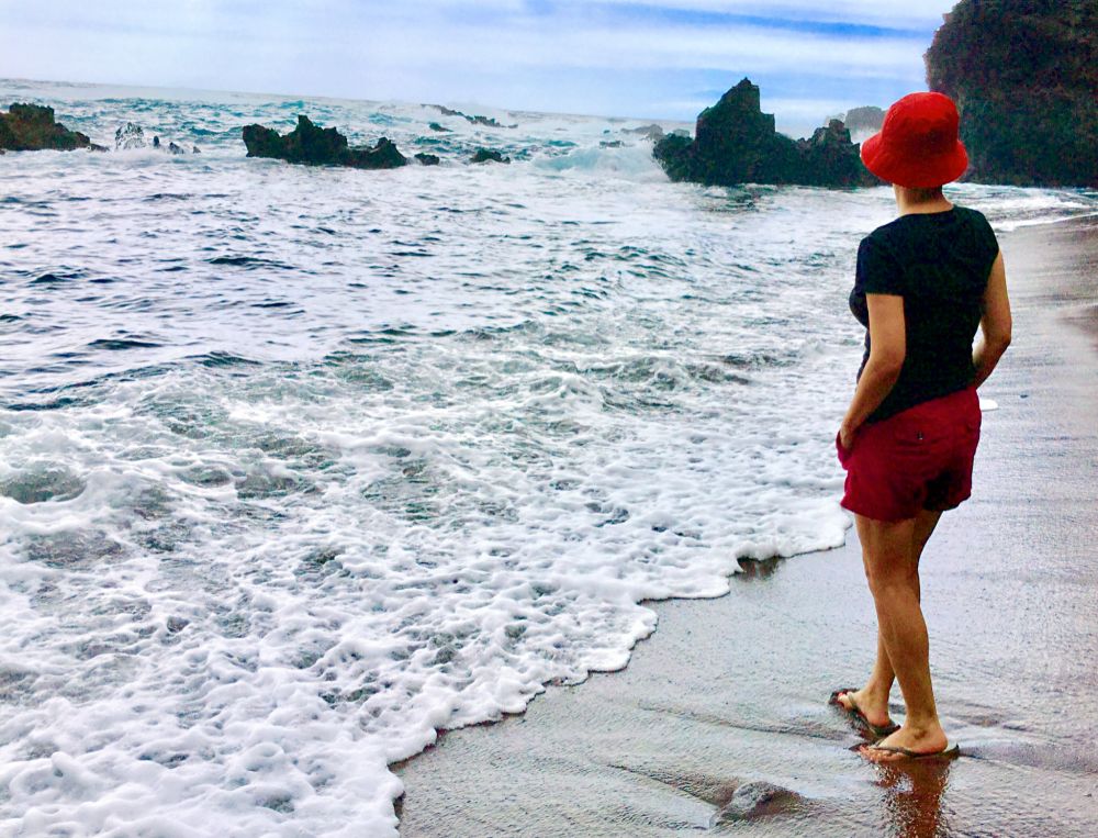 现在我们在茂宜岛,到了日程里要去hiking的日子了,我依然穿着我喜欢的二指拖鞋随大家出发!我们先去红沙滩和黑沙滩,之所以红是因为火山爆发引出的化学结果,黑是岩浆被海浪冲刷而成。。。非常特别的沙滩!