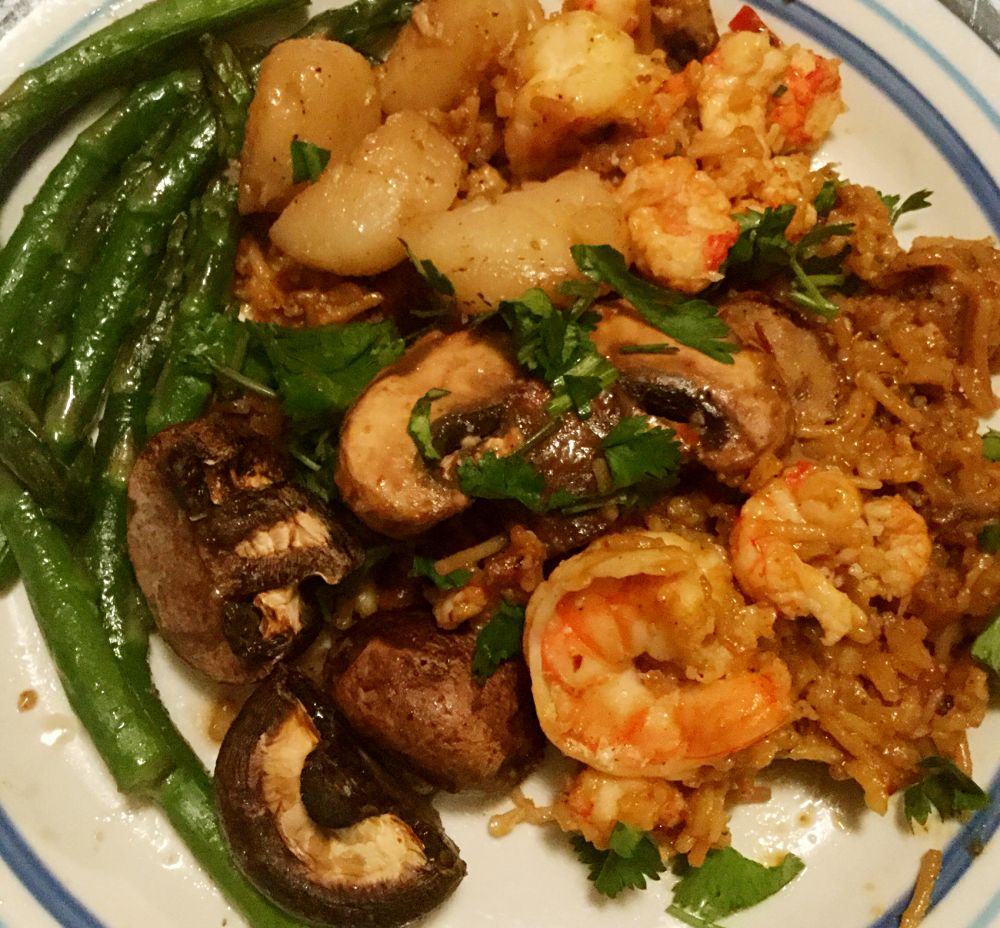 昨日晚餐老板做了一个儿时”爸爸的味道”:大虾+小龙虾(Costco买的智利剥壳鲜熟急冻小龙虾)+鲜干贝+大白蘑菇+芦笋,一番烹调后全盖在酱香鸡米饭上。。