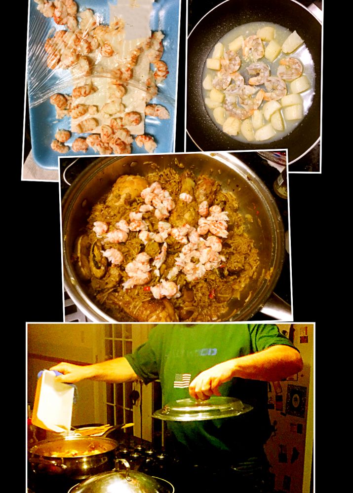 3)灶台一个锅炒干贝和虾,一个锅焖酱香鸡米饭,上面点撒小龙虾。。