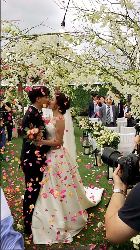 在首尔汉江浮岛的顶层露天花园,一对韩国新人在举行婚礼