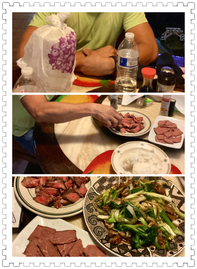 青菜炒鸡菇是我的“作品”,steak 牛肉是老板的拿手菜, 意大利酒味蛋糕是店里买的, 牛肉旁边那盘也是老板做的咸牛肉,得煮好久的一道菜。我不爱吃,师傅和工人都说好吃。