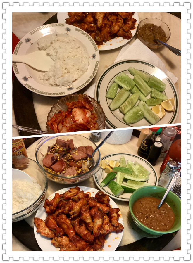 老板看他们蛮喜欢吃烤鸡腿, 第二天又烤了一盘鸡腿,还用玉米炒了一个罐头肉,我把自家菜地的青黄瓜切了一盘,他们很是喜欢这种有机蔬菜,然后把柠檬汁和盐一起撒在黄瓜上混着吃,说在他们国家就是那样吃黄瓜的。