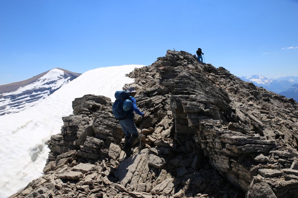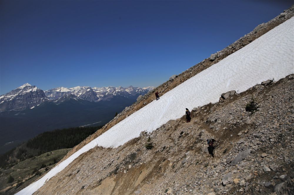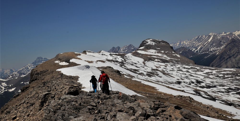 这一天我们并未走完从保卫山至畸恋峰的整条山脊,而是停留在两山之间的假峰上。从假顶上看畸恋峰仿佛近在咫尺,但是往返之间估计也要一个多小时,其时已经超过下午2点钟,于是队长决定就此停步,休息之后打道回府。在顶峰上,看与保卫山和畸恋峰毗邻的城堡山和白头翁山连绵起伏紧密相连,仿佛在像我们叙说着一个热情似火的爱情故事。故事里有城堡,有被英雄保卫着的美人,还有不为世人所容的不伦之恋以及白头偕老的誓言。。。想着那些浪漫的山名,我想到没有自己的历史文化背景的加拿大人也有浪漫的一面。或许,正是因为没有历史文化的束缚,这种浪漫更加有着原生态的本能色彩,正如这些原生态的落基山脉一样充满原始的魅力。