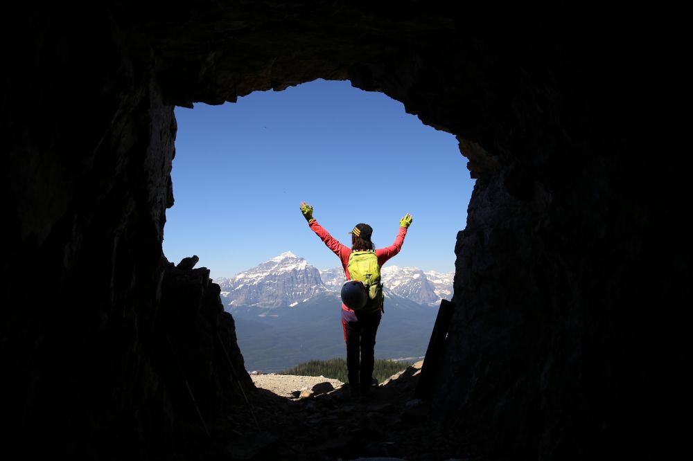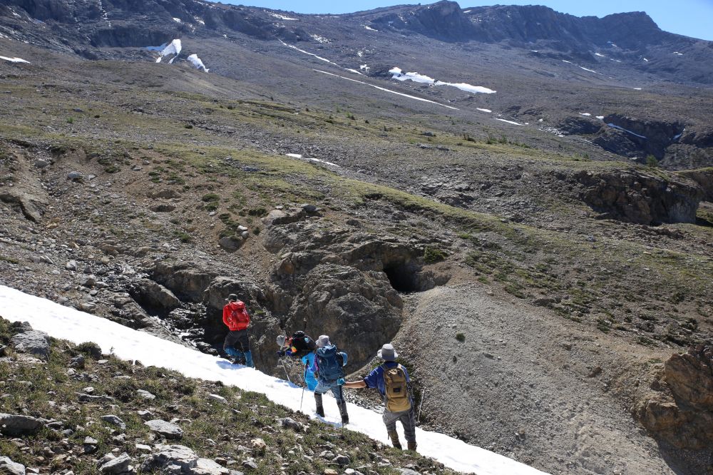 那样奋力奔跋了一个多小时之后,我们走出了树线,眼前是峭壁陡立的碎石坡,石坡上还留着大片大片未融的残雪,而保卫山和畸恋峰看上去只是两个小尖角。那些残雪与险峻的灰黑岩石相间,形成一道道美丽的黑白纹路,给光秃秃的岩山平添了一抹优雅的色彩。在乱石嶙峋的碎石坡上又爬了半小时左右,就来到一个幽深的铜矿洞口。据说那个铜矿是19世纪末遗留下来的,100多年前,人们在那里挖铜、银和锌。铜矿看起来像盘丝洞一样幽深,我走进去时觉得有些恐怖。洞壁有些石头的颜色蓝蓝绿绿的,可能那就是铜或者锌。看着那些色彩斑斓的岩山我曾想:岩石里会不会有钻石呢?这段时间我正在看《血与铁(Blood and Iron)》--- 那是一本与这个铜矿年代相近的书,是由一个名叫李显光的人在140年前写的记录他参加修建加拿大太平洋铁路的日记改编的小说。那本书记载了华人被白人歧视欺压的血泪史,看得我血脉偾张,书中的人在忍无可忍时就想逃跑去淘金。那是一个淘金挖宝的年代,看来除了淘金之外,也有人想找金银钻石。要爬上这样的悬崖峭壁上挖掘财宝也殊为不易啊!从洞里往外看去,铜矿的洞口好像一个形状奇特的相框,非常好看。