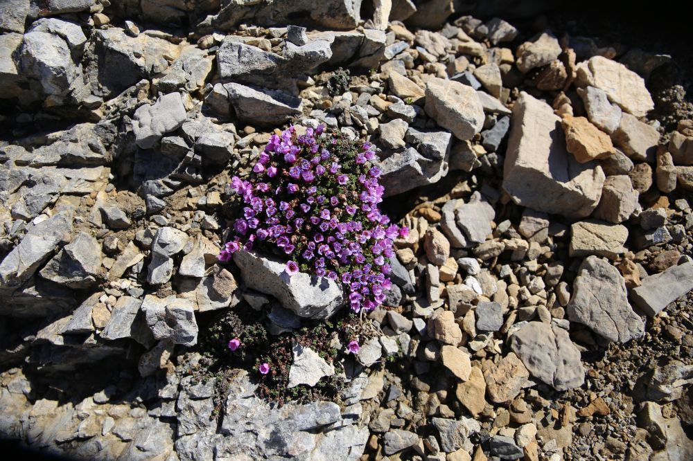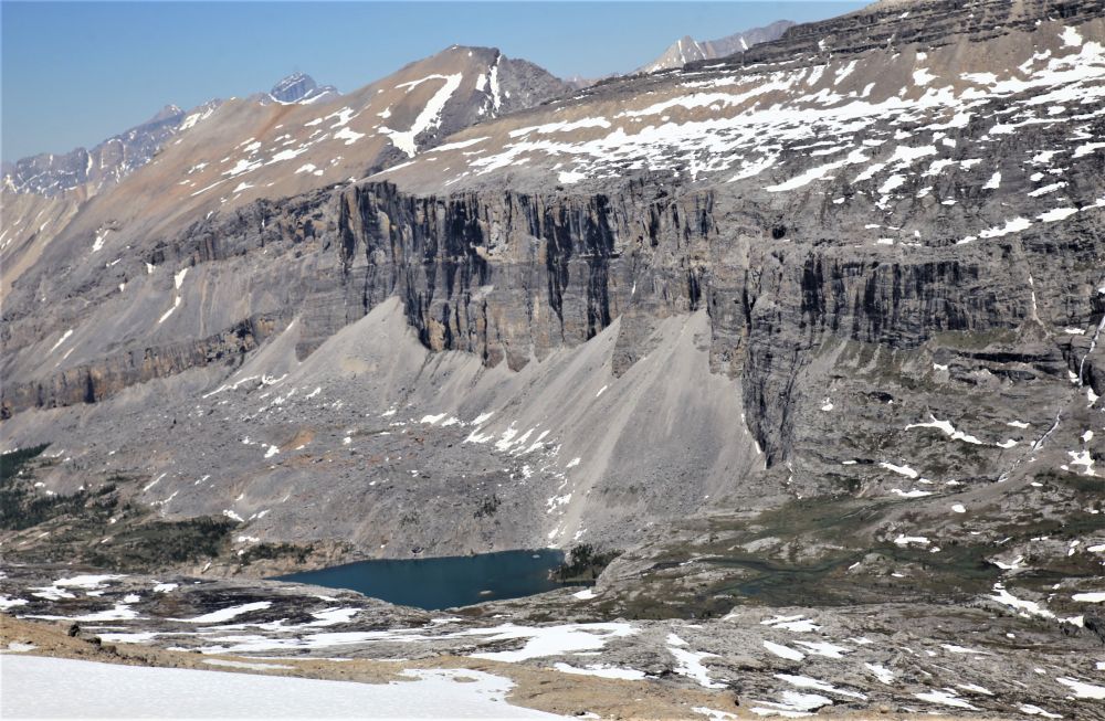 我们在铜矿前吃西瓜休息,拍照留念,之后便继续沿着积雪的岩壁碎石向保卫山冲顶。那段岩壁碎石坡大约是1公里爬高500米左右,颇为陡峭,好在大部分积雪都已融化,走起来并不太危险,只是极费体力。上到山脊之后,但见厚厚的积雪在山脊的左侧形成一道美丽洁白的雪脊,一直延伸到前方仿若悬在半空的保卫山山顶。我们从山脊走向左边的保卫山,再从保卫山沿着山脊走向右边的畸恋峰,奇迹谷(wonder valley)在雪脊下方被白头翁花山(Pulsatilla mountain)环抱着。走在微风习习的山脊上,被壮丽的群山环绕,俯瞰有着鬼斧神工般的美丽壁纹和宝石般闪耀的湖光的奇迹谷,我不禁心醉神迷,忘记了一切忧伤。