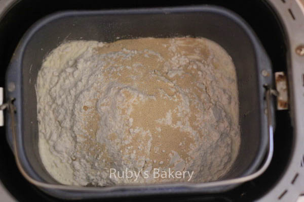 1. 面包机依次放鲜奶油,牛奶,糖,盐,鸡蛋,面粉,酵母。(注:黄油不放)