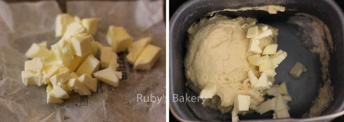 2. 启动面包机的揉面程序,揉面结束后(大约10分钟。不同面包机时间可能不同),停止程序,放入切小块的黄油,再重新启动揉面程序,直到整个程序结束(包括揉面和发酵)。