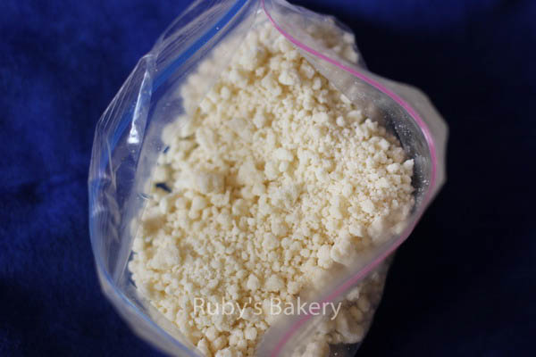 把材料B中的糖粉(powder sugar),面粉,奶粉混合均匀,再加入直接冰箱里取出的黄油,带个一次性手套,轻轻搓成均匀细小的小颗粒,就制成香酥粒了