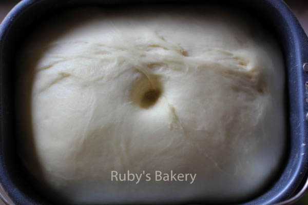 3.发酵好的面团,手指插个洞,洞不回缩面团也不塌陷。(注:洞回缩说明没发酵后,再继续发酵一会;塌陷说明发酵过头)