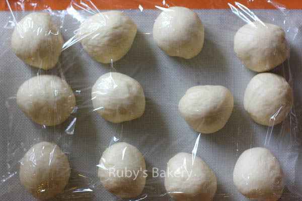 4. 面团分割成12等分(每份约68克),滚圆后盖上保鲜膜,松弛约15分钟。(注:如果方子没有2倍,那么只要分割成6等分)