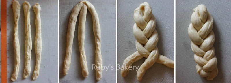 5.松弛好后的面团,每3个一组,整型成28厘米(约11 inch)的长条形,编辫子