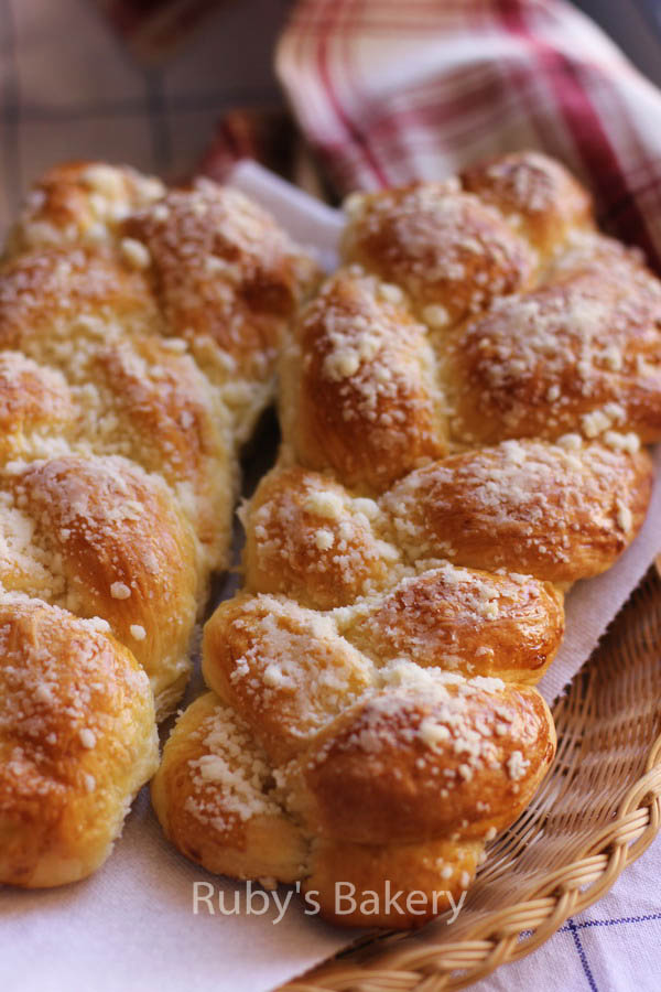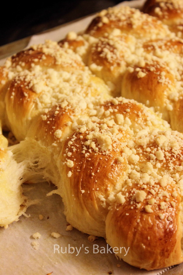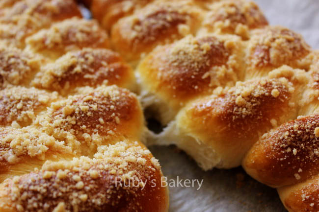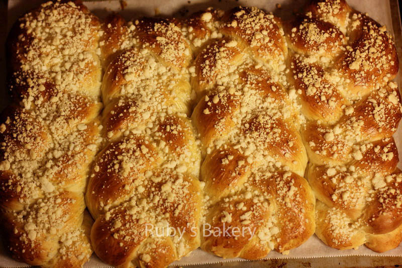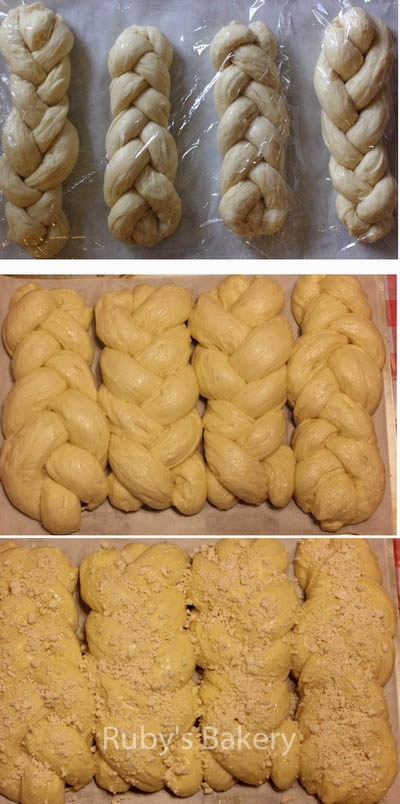 6. 2倍方子量做4个辫子,放入烤盘最后发酵至2倍大,表面轻轻均匀的刷上蛋液,撒奶酥粒