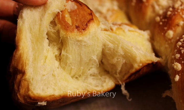 注:上面面包体的方子量很小,只能做2个辫子,我都是2倍方子量,即400克面粉,做4个辫子。酥松粒的量足够4个辫子面包,不需要加倍。
