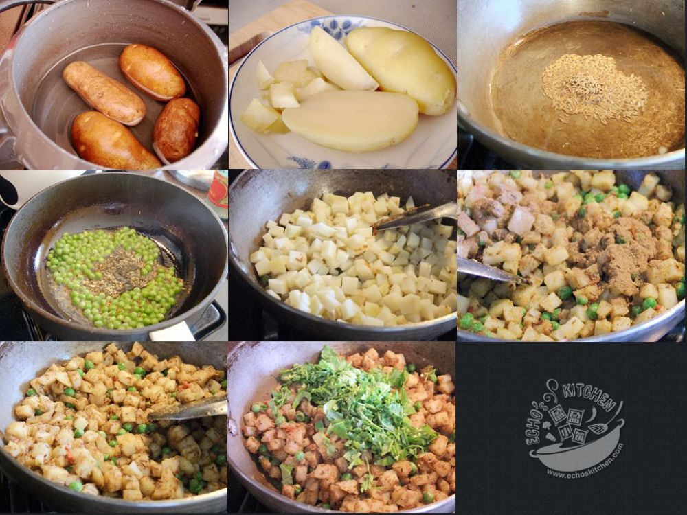 4. Add the potato cubes, stir well and cook for about 8 minutes, use a potato masher to press the potatoes a little if you like. Add dried mango powder and chopped coriander leaves, mixed well and let cold.