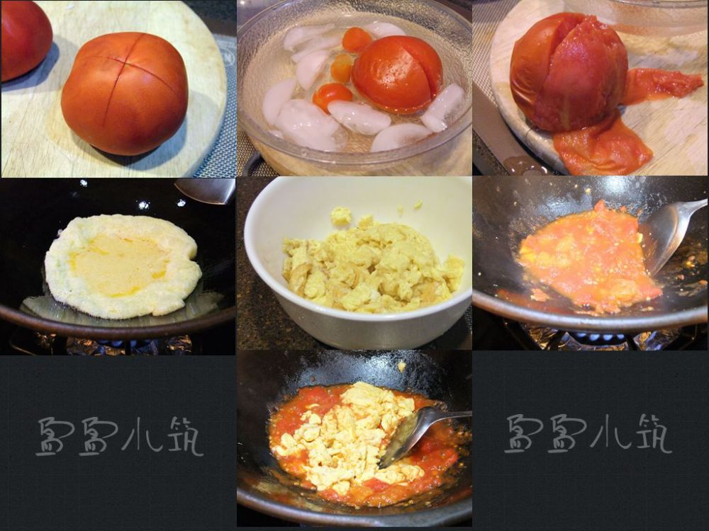 1. 首先鸡蛋里加一点点盐和胡椒粉打散。番茄尾端划十字,入滚水里烫1-2分钟,然后泡到冰水里1分钟。把皮剥去丢弃,剥好的番茄备用。