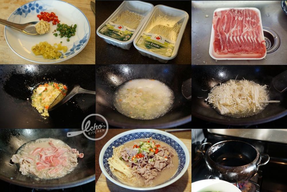 3. 倒入鸡汤煮滚,加入金针菇煮30-45秒,盛出铺到碗底。