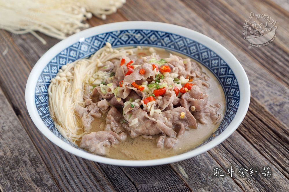 4. 锅里的汤再煮滚,加入肥牛片煮45-60秒至牛肉变色,别煮太久了,牛肉会老。加入白醋和食盐调味后把牛肉和汤汁倒到装有金针菇的碗里。