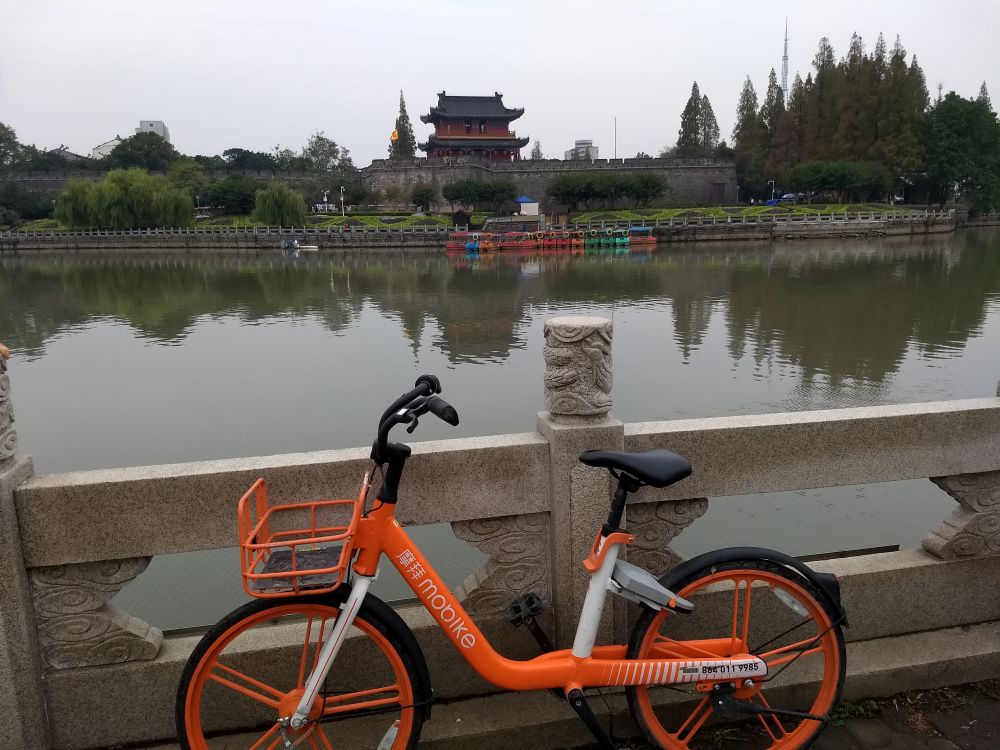 老天爷又赏脸了。昨天一夜秋雨,今早停了!第一次用国内的共享单车,太便宜了(1元/小时)!车子状况,比美国的差一些,今天绕老城墙里外骑了一圈,累得我!