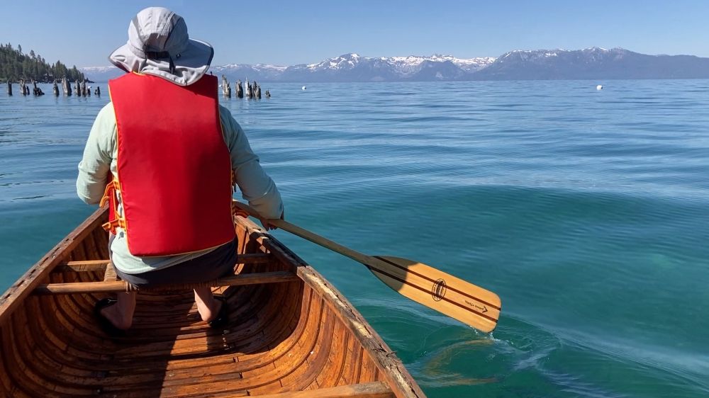 5、今天趁着早上风平浪静,咱俩又去划船。不过几天功夫,湖对面山上的雪化了不少。