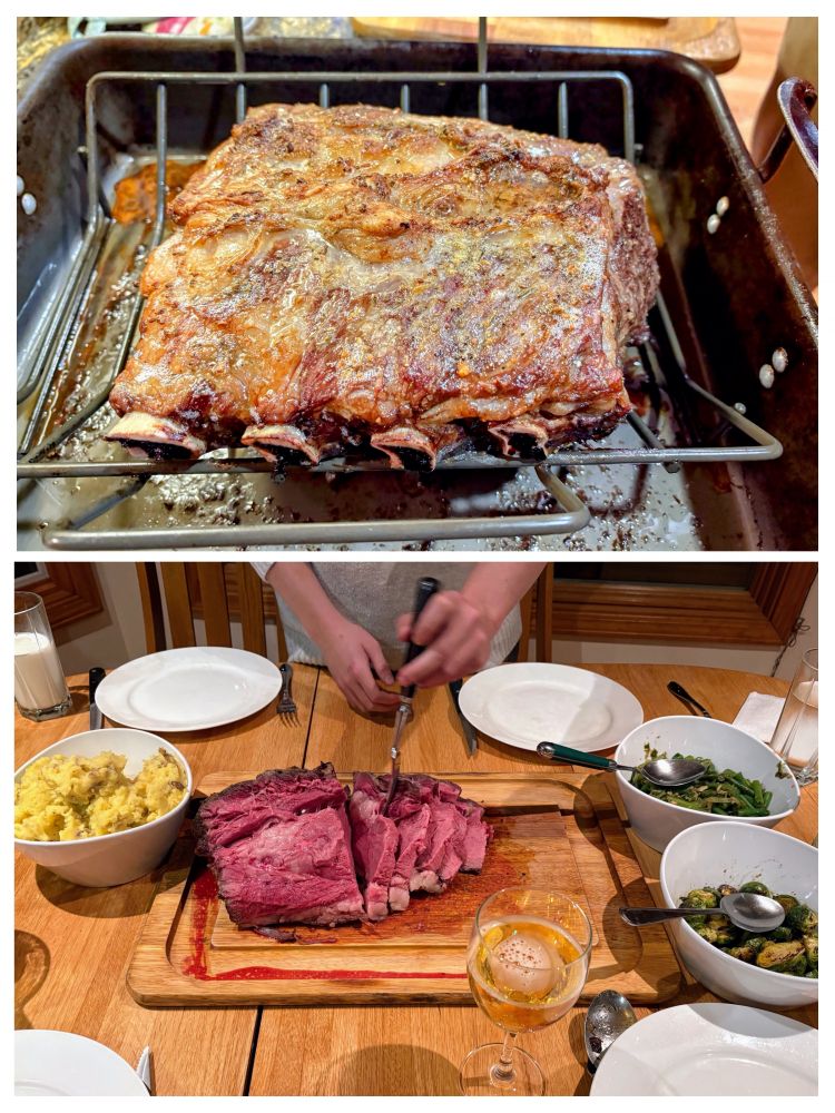 又是一年一度圣诞节。今年的圣诞晚餐是儿子做的烤牛排(roasted prime ribs),8斤重的牛排,整整花了5个小时,低温慢烤(250F,4个小时),味道非常好,入口即化的感觉。看来这要成为我家的传统圣诞主菜了。主食是土豆泥和烤红薯,蔬菜有烤球芽甘蓝(Brussels sprouts),和用小美做的辣炒四季豆。