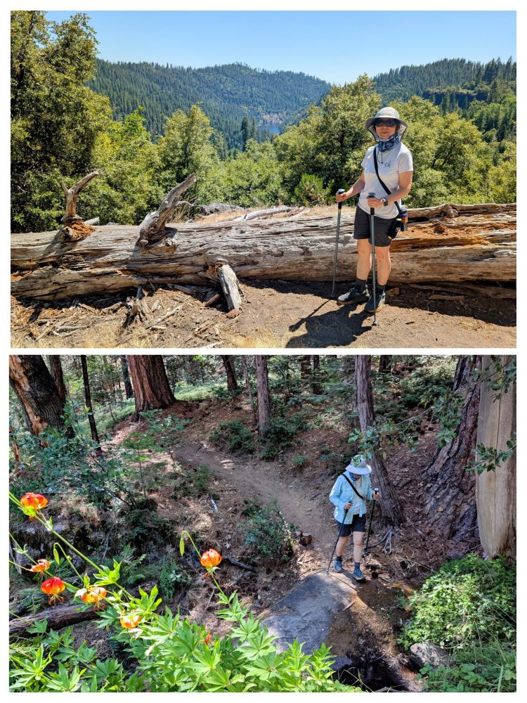 然后,走了两条步道:Canyon to River trail(山谷到河流步道),Lava Bluff Trail(熔岩崖步道)。大树州立公园海拔4000多英尺,位于Stanisus National Forest (斯坦尼苏斯国家森林)境内,Sierra Nevada山脉的雪线之上,公园里有巨型红衫,肥沃草甸,五彩野花。