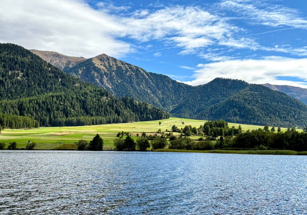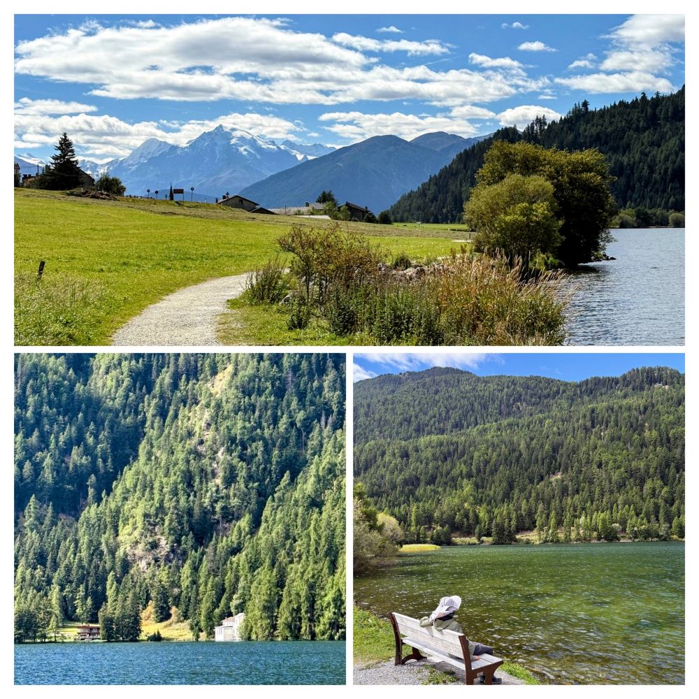 住了2天的Reschen在湖边,北面的Reschensee(Lago Di Rasia)是个人工湖,比较大。南边的无名小湖是个自然湖。我俩在旅馆里呆着无聊便乘公交车过来沿着小湖的步道走了一圈(5公里)。公车票是旅馆老板给的免费车票,这里是旅游区,和Dolomites多洛米蒂一样,住旅馆的游客都可以免费乘坐公共汽车。