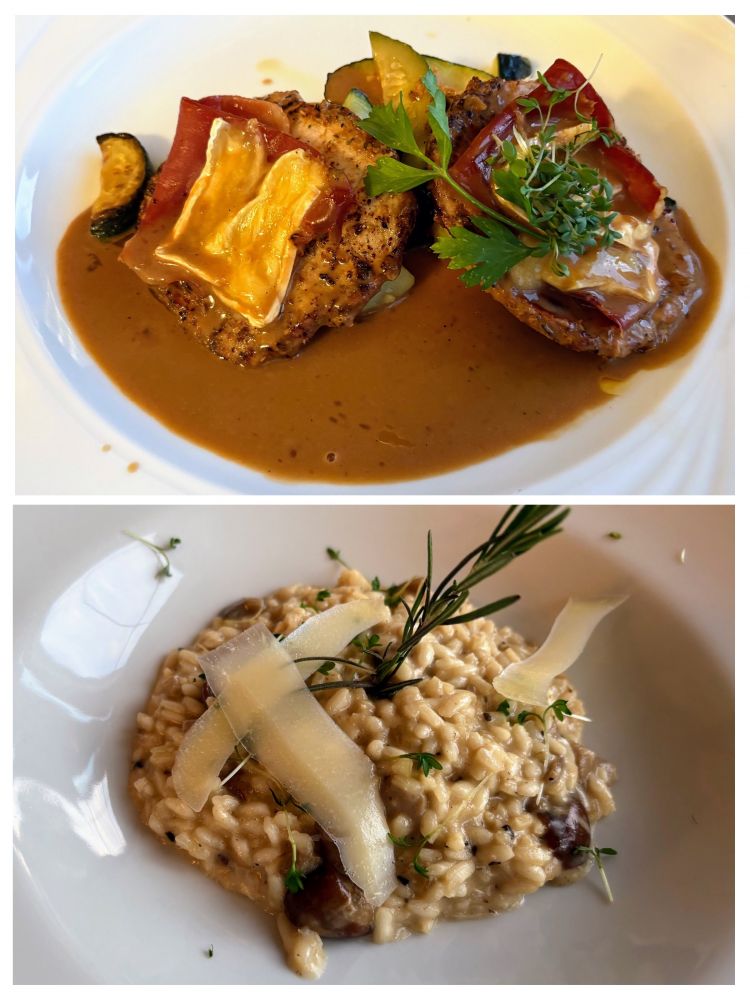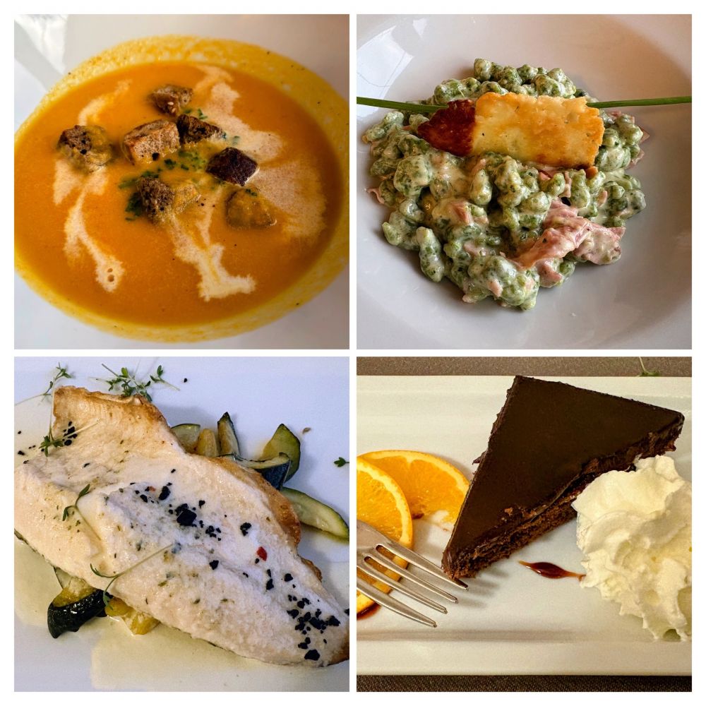5、晚上在旅馆的餐厅吃的4道菜套餐:1、前菜—南瓜汤,2、主食-火腿土豆面嘎哒,3、主菜-烤鳟鱼,4、甜点-巧克力蛋糕。