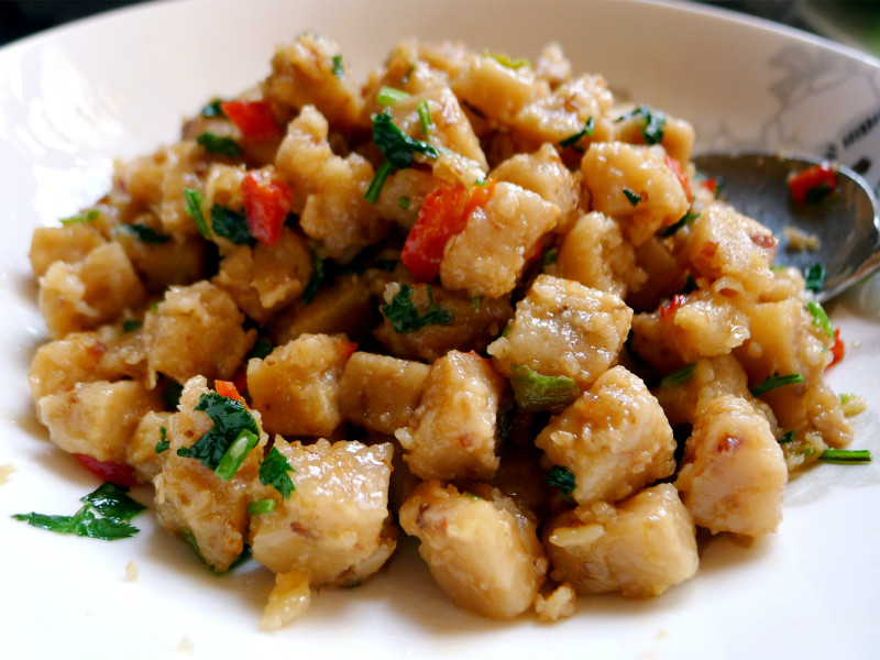 做法: 蒸好放凉后的萝卜糕切小块, 少油煎炒好成出来。 再炒香剁椒和一点芫荽末, 拌进煎好的萝卜糕里, 放少许生抽和香醋就好了。 我喜欢拿这个做午饭的主食, 因为考虑到热量比较高, 想要减肥的同学们千万不要晚上吃哦!