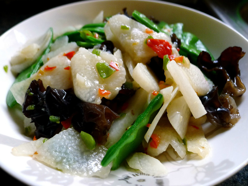 做法: 山药切片(不能太薄, 否则炒完就不爽脆了)和雪豆木耳同炒, 放点盐和剁椒提味。 因为山药本身很黏, 炒的时候我会放一点点鸡汤。