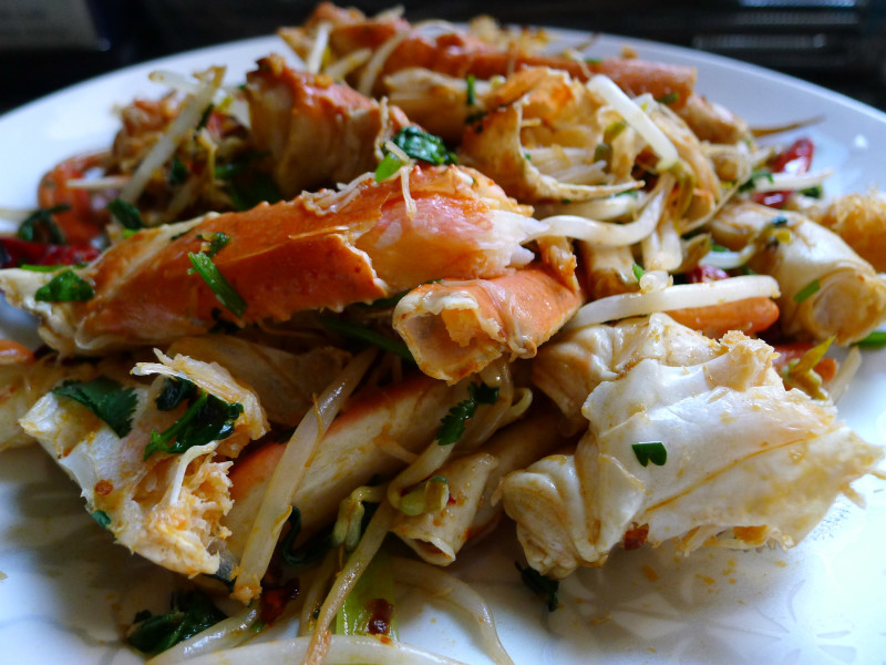 做法:蟹腿先用工具给敲碎了,以便吃的时候不用太折腾。 锅里少油爆香花椒粒, 干辣椒,蒜片, 葱段,芫荽末后, 放入处理好的蟹腿, 加两勺老干妈辣椒油, 少许生抽(千万别多了, 因为蟹腿和辣椒油本身带咸),糖, 起锅前放些豆芽炒炒就好了。