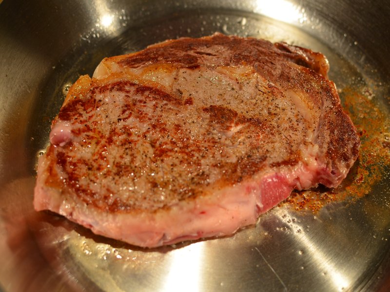1. Rib Eye 去骨牛排一块,330克(约11盎司),在室温下放50分钟到一小时。两面撒黑胡椒(先不撒盐)。中高温加热不锈钢平底锅到大约360华氏度(180摄氏度)(水珠滴在平底锅里不立刻蒸发,而是分散形成银色的滚动的小水珠)。调低火力50%,然后放入牛排,平压牛排表面,挤出牛排和锅之间的空气,使牛排紧贴锅底(这时候肉粘锅,但没关系,别去铲动)。定时三分钟。