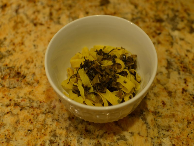 中火起油锅,油热后下咸菜炒一分钟,略加一点点糖调味。然后放入百页丝一起炒。开始会感觉百页有些干,但是别加水。翻炒一会后,百页丝会变软,尝尝味道,调节咸淡(也可以加很少量的辣椒粉,让菜略带些辣味)。再炒一分钟,淋上麻油,就好了。