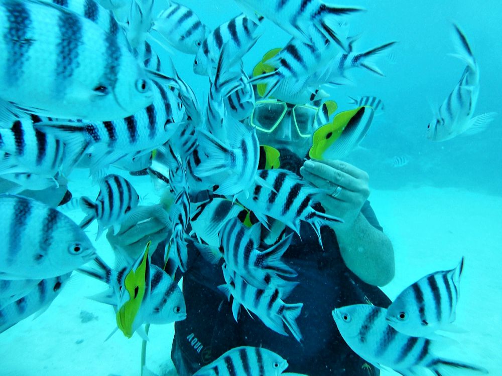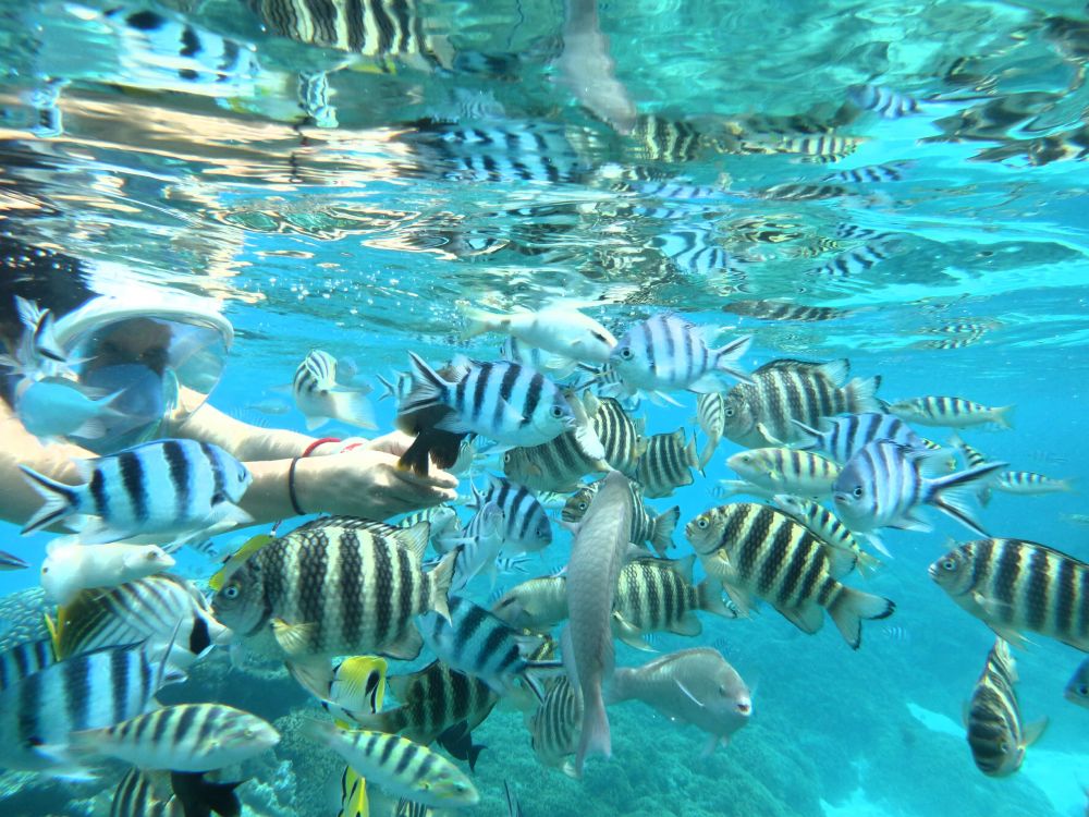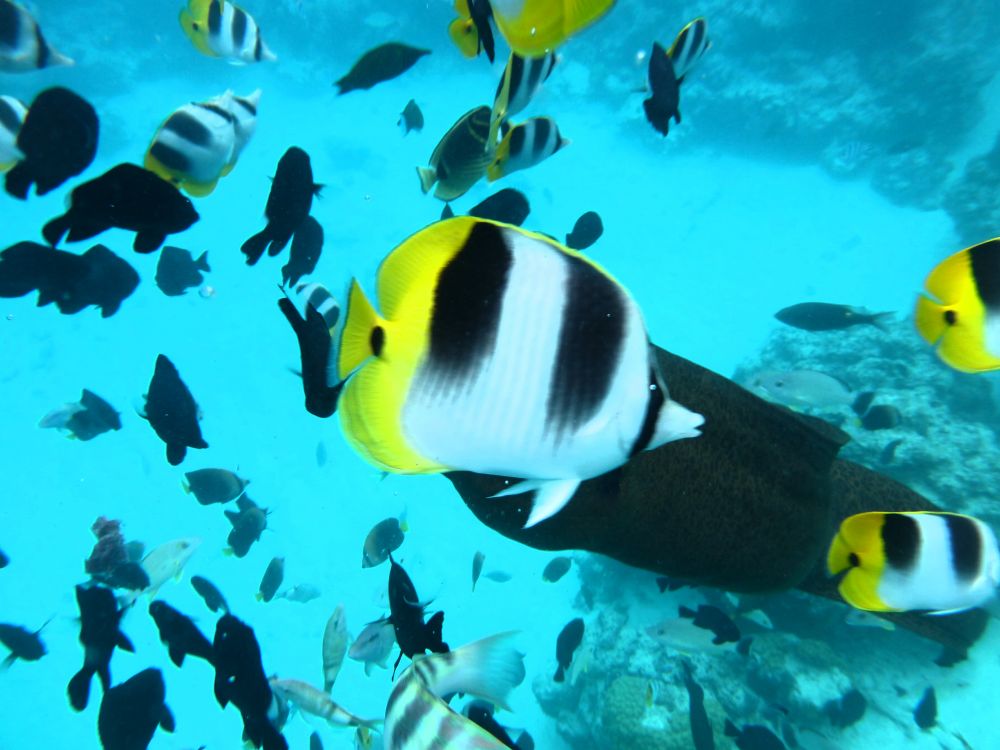 经过了二十多个小时的飞行,我们终于回到了家。这次旅行虽然经历了热带风暴,还是很满意我们玩了所有的想去玩的项目。曾经到过墨西哥,夏威夷,泰国,哥斯达黎加....的海湾,竟然没有见过这么美的海水。整个岛屿被浅浅的泻湖围绕,象一个大游泳池,水深也就到胸部。如果愿意,可以随时把头伸进海里去看鱼。连鲨鱼也生活在这浅浅地水里。