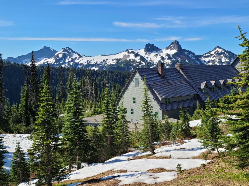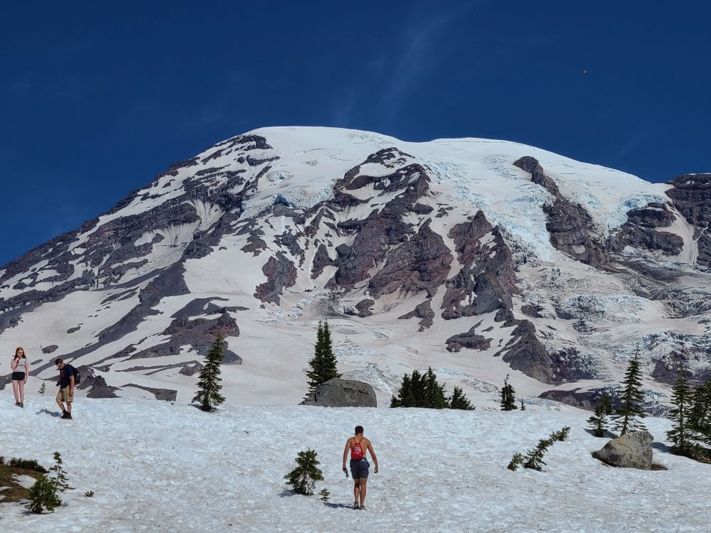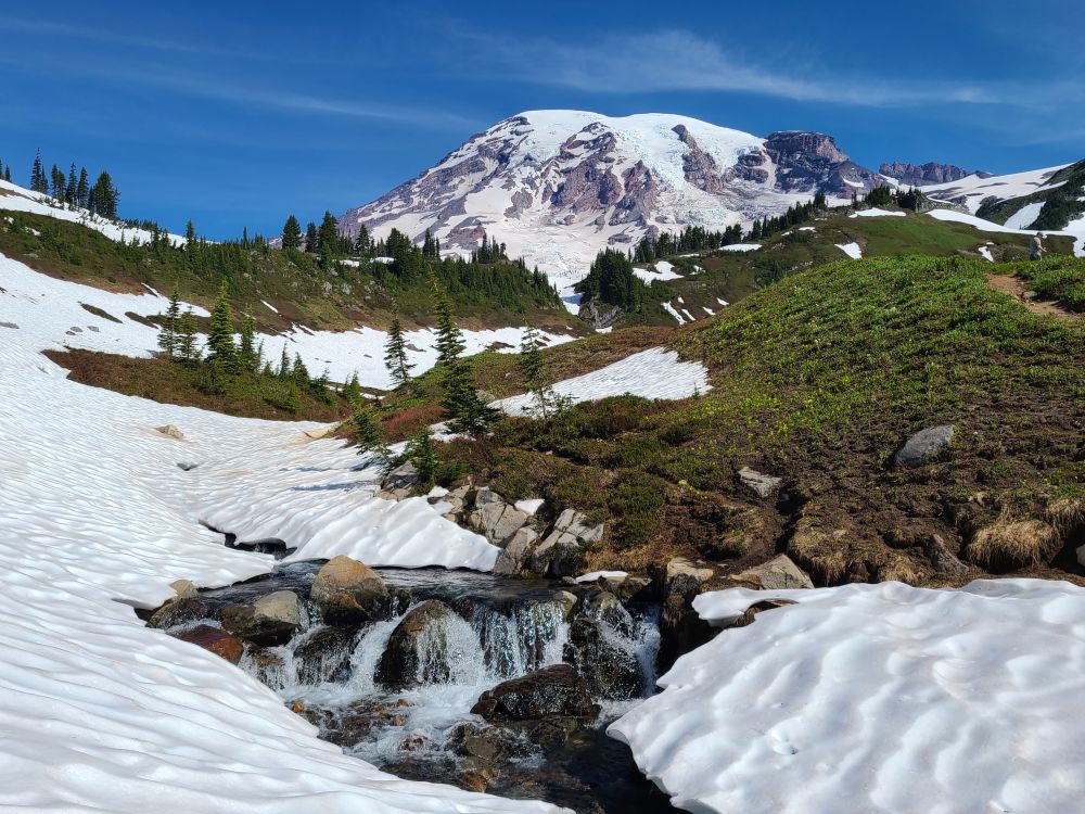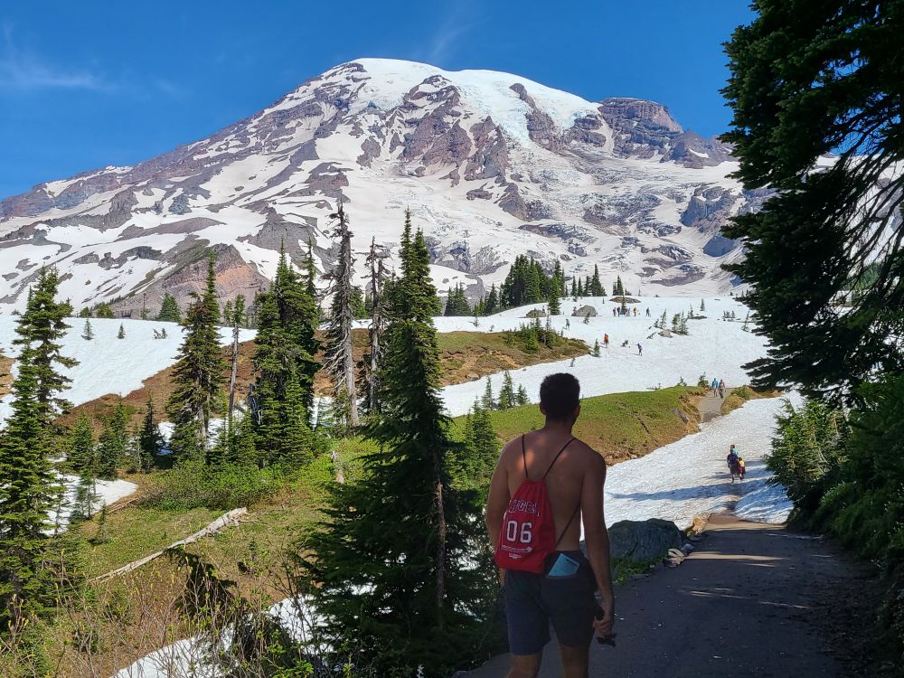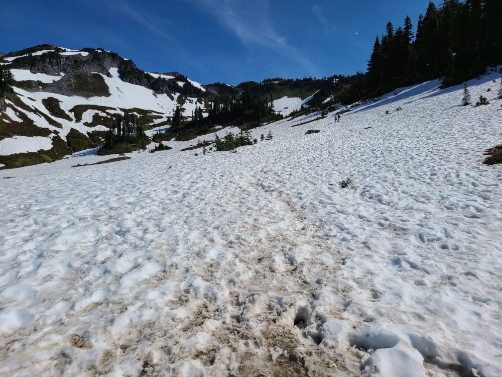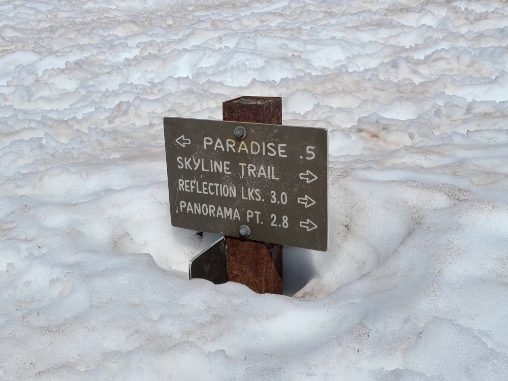 本以为夏天的Mt. Rainer应该是鲜花盛开的季节,没想到所有trail都堆满积雪,没有专业设备走完trial会很难。去年的八月底去的时候遇到大雾天气,没有把skyline trail走完,我一直想完成这个心愿,于是决定周日早起,自己去把那个trail走完。星期日一早开车出去,到达sunrise parking lot的时候是9:00am 左右。谢天谢地,还有几个parking lot可以停车。一路上我一直担心周末的早晨会没有停车位,因为这个国家公园总是西雅图最受欢迎的景点。谁知道没看到鲜花遍地的Rainer 山,倒是盛夏里进入了冰雪世界。