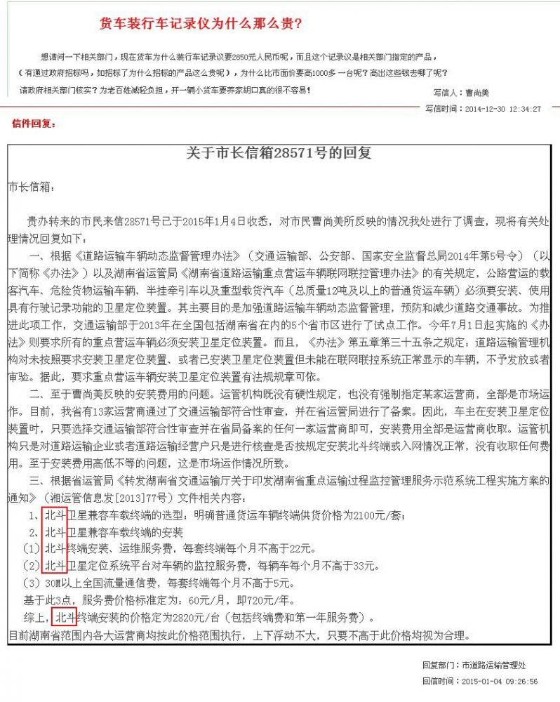 市长信箱回复货车记录仪为什么那么贵:北斗终端安装2820元!