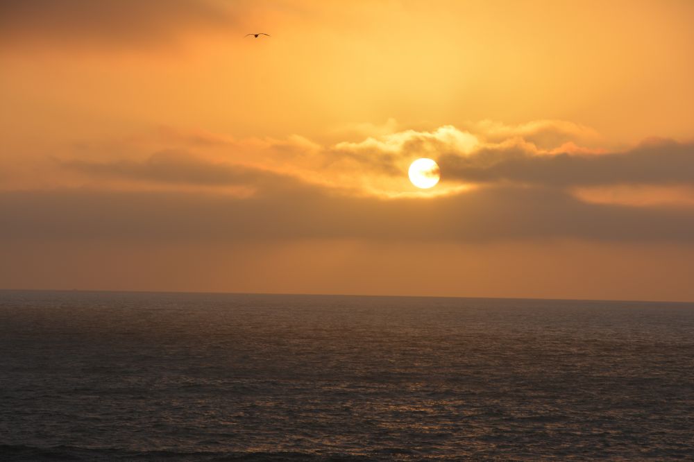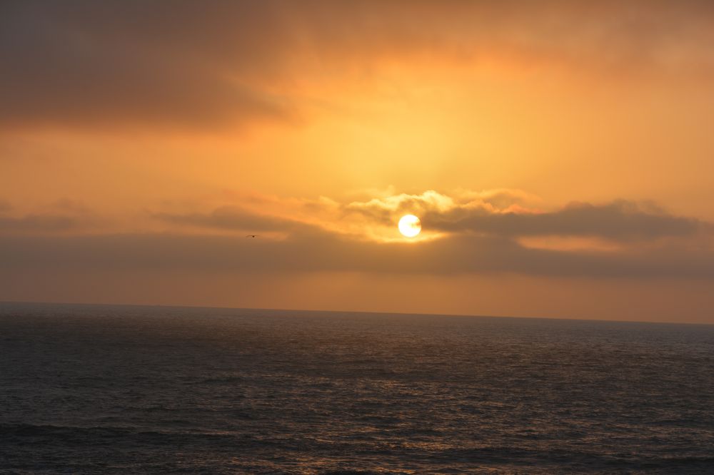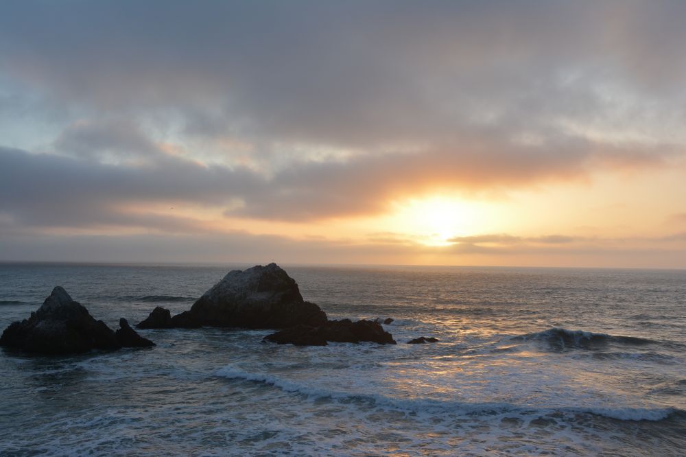 眼看太阳快西 下,我要赶上我们今天的最后一站-Sutro Baths,这里迎面有Seal Rocks,是看夕阳西下的最好位置。当你看到四个小姑娘并排坐在崖石边上,除了称赞她们的胆量,还一直没搞清楚她们是如何坐上去的,不信有照片为证。本 以为我顶着强风,最终可以看到一个美丽的晚霞。但我只看到一个非常一般的日落,心里本是一翻遗憾。但之后一想,这本应就是大自然的规律,不可能天天晚霞光 艳夺人,人生不也是如此吗?